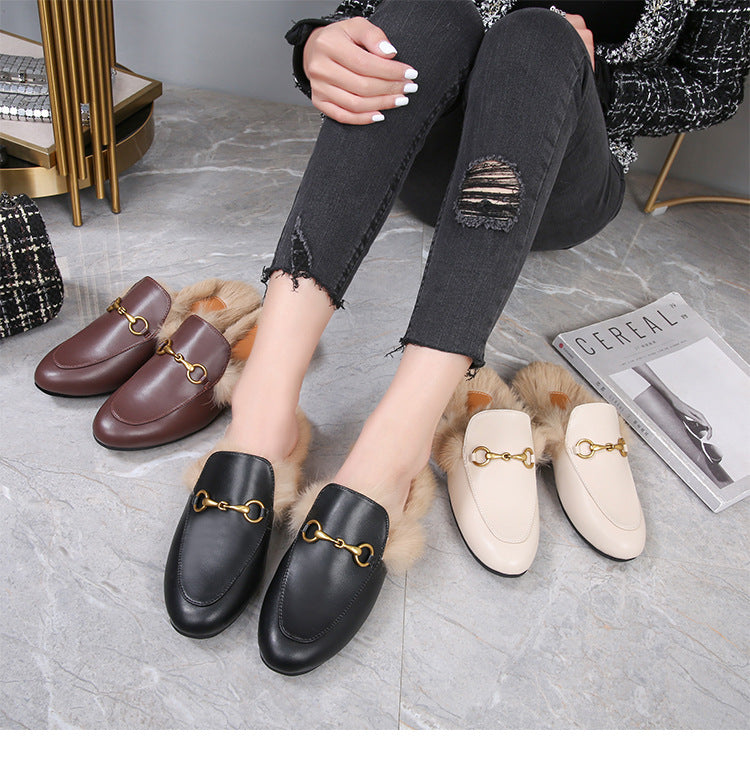 Γυναικεία Mules Flat με Διακοσμητική Αγκράφα & Επένδυση Γούνας