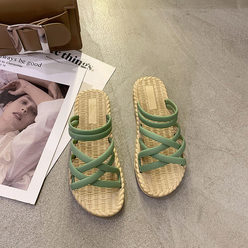 Ελαφριές και στιλάτες καλοκαιρινές παντόφλες με φυσική πλεχτή υφή στη σόλα και άνετα χιαστί λουράκια που αγκαλιάζουν το πόδι. Ιδανικές για καθημερινές εμφανίσεις μέσα και έξω από το σπίτι. Ο σχεδιασμός τους προσφέρει σταθερότητα και στήριξη, ενώ η ανοιχτή κατασκευή αφήνει το πόδι να αναπνέει.