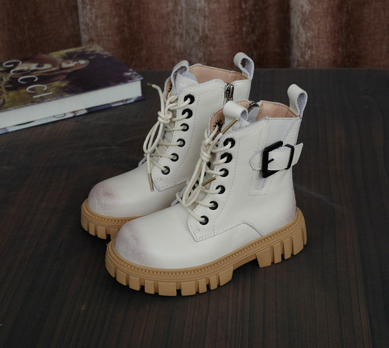 Ανθεκτικά μποτάκια με κορδόνια και πλαϊνό φερμουάρ για εύκολη εφαρμογή. Διαθέτουν στιβαρή σόλα με βαθύ πάτημα, ιδανική για καθημερινές δραστηριότητες. Στο πλάι υπάρχει διακοσμητική αγκράφα για μοντέρνο στυλ.