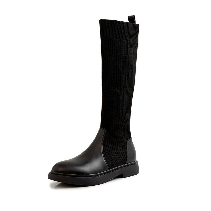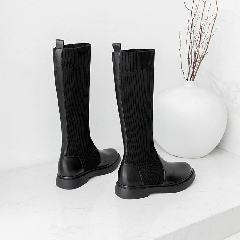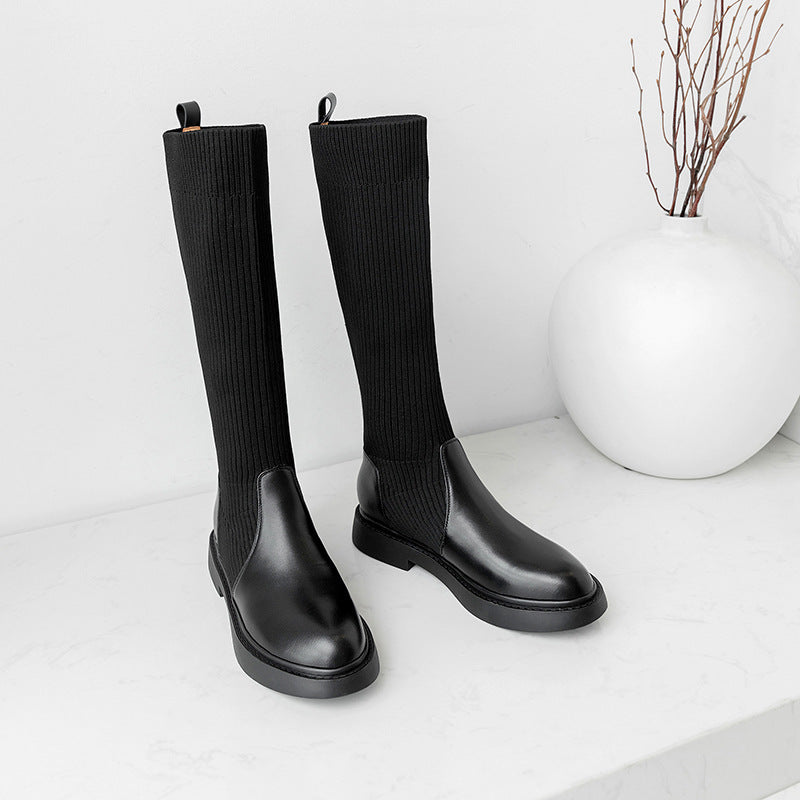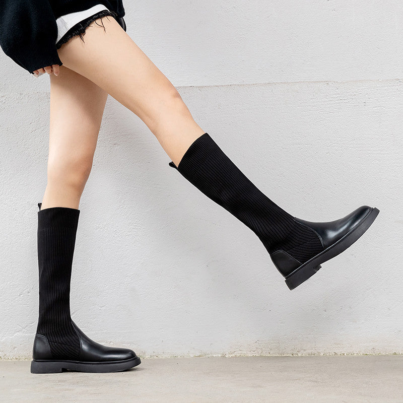 Μπότες με Συνδυασμό Δέρματος και Πλεκτού Στο Ύψος της Γάμπας