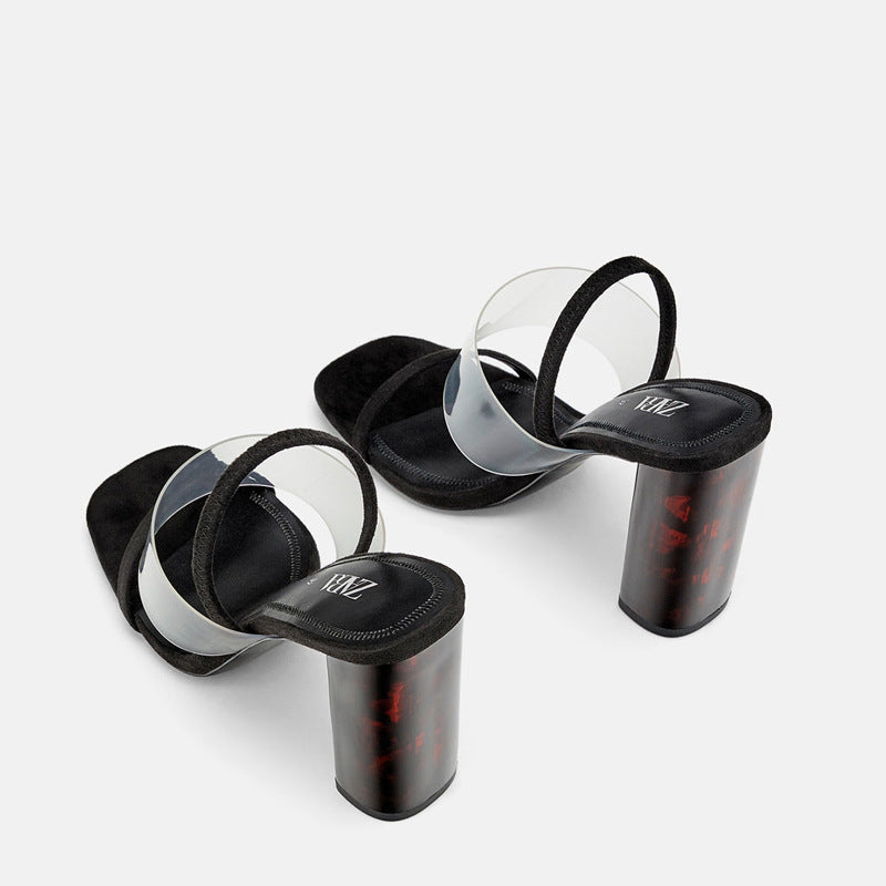 Σύγχρονα πέδιλα με ιδιαίτερο διαφανές λουράκι και λεπτό μπροστινό strap, που αγκαλιάζουν διακριτικά το πόδι. Το ψηλό, χοντρό τακούνι σε σχέδιο ταρταρούγας προσθέτει χαρακτήρα και σταθερότητα, ιδανικό για σικ εμφανίσεις.
