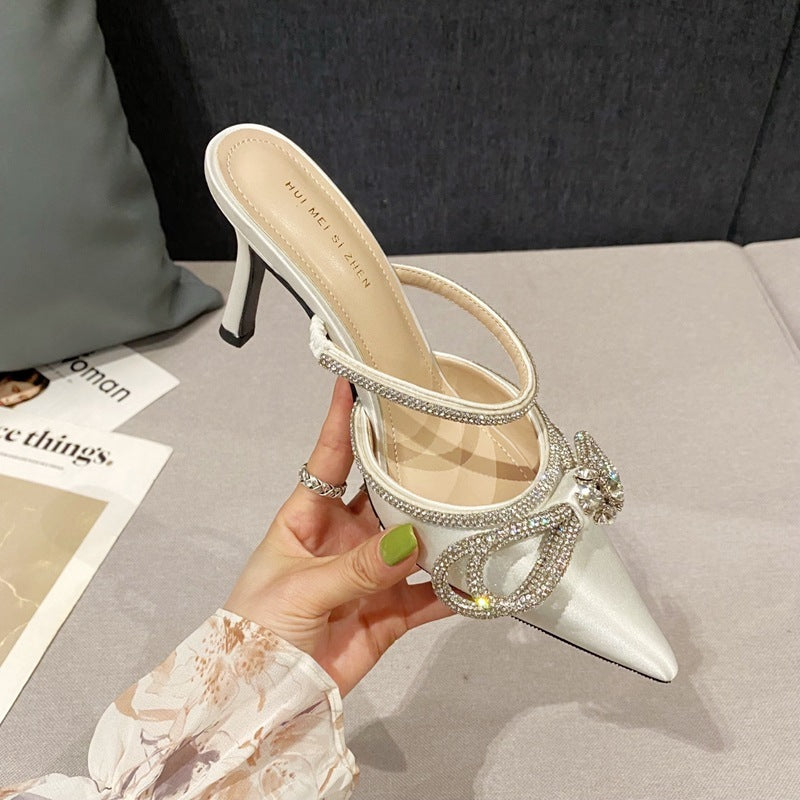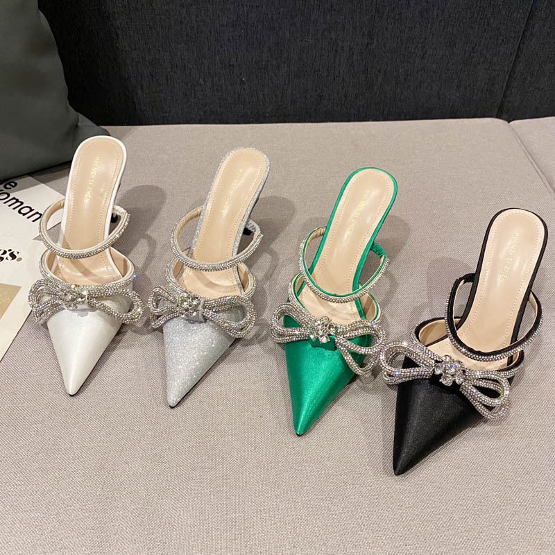 Εντυπωσιακά mules με μυτερή μύτη, διακοσμημένα με φιόγκο από στρας και πέτρα στο κέντρο για έξτρα λάμψη. Το διπλό διακοσμητικό λουράκι στο κουντεπιέ ενισχύει το glamorous look, ενώ το τακούνι προσφέρει θηλυκή και εκλεπτυσμένη γραμμή για βραδινές εμφανίσεις και ειδικές περιστάσεις.
