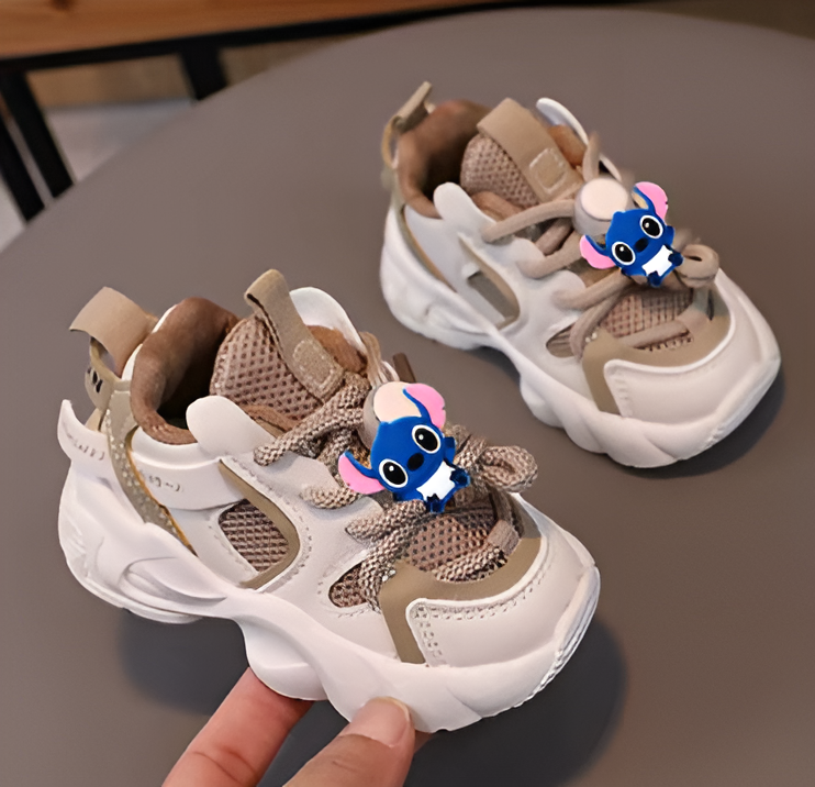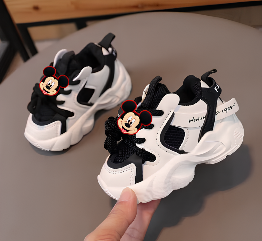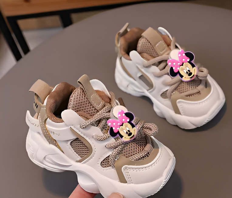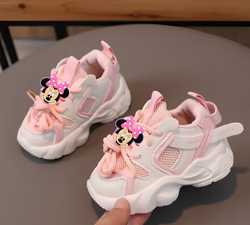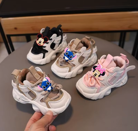 Παιδικά αθλητικά παπούτσια με διαπνέον υλικό και αναπαυτική σόλα, διακοσμημένα με αγαπημένους χαρακτήρες όπως Minnie, Mickey και Stitch, διαθέσιμα σε διάφορους χρωματικούς συνδυασμούς. Εύκολο κλείσιμο για άνετη εφαρμογή, ιδανικά για παιχνίδι και καθημερινές δραστηριότητες.